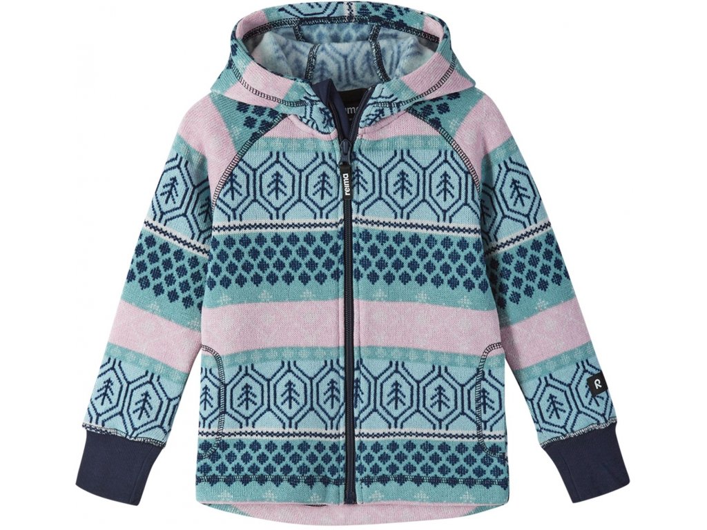 Dětskou mikinu Reima Northern lze nosit samostatně nebo jako hřejivou střední vrstvu. Použitý fleecový materiál je pružný, rychleschnoucí, velmi příjemný a pohodlný na nošení. Mikina má pevnou kapuci, raglánové rukávy a na předním dílu se zapíná na dlouhý zip vybavený chráničem brady. Zadní díl má prodloužený, vytvarovaný do oblouku. Rukávy má zakončené pružnými manžetami ze žebrované pleteniny. Mikina má dvě boční kapsy. Zdobí ji celoplošný potisk na motivy norských vzorů. Použitý materiál obsahuje certifikovaná recyklovaná vlákna.
