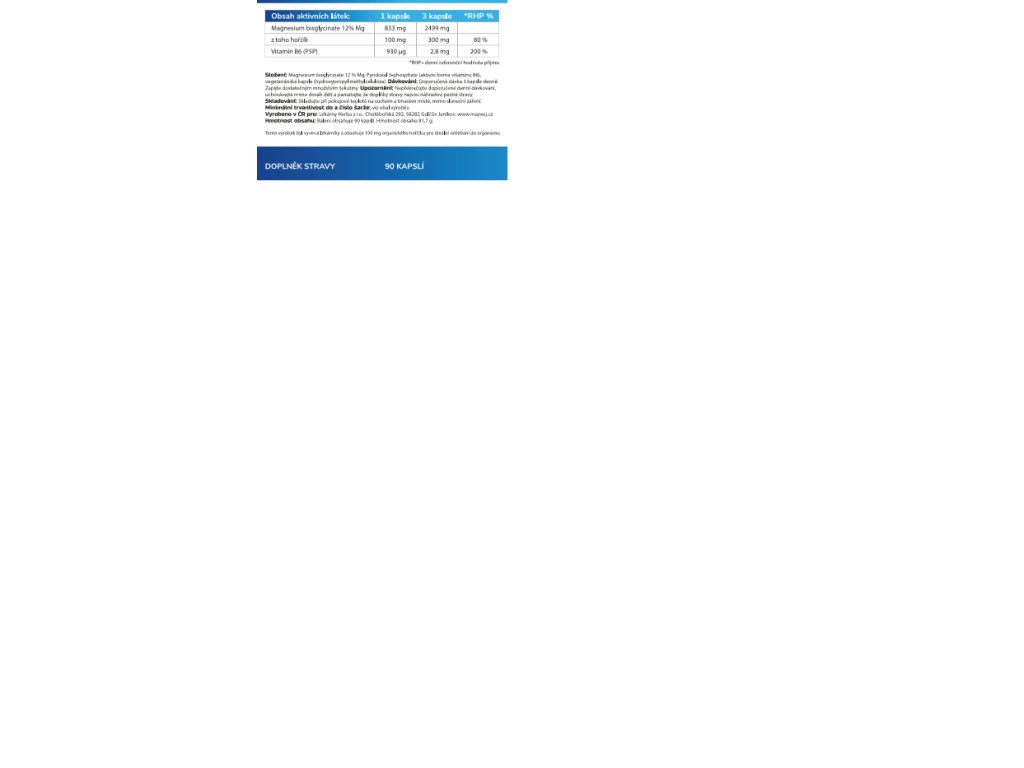 Magnesium bisglycinate 12 % Mg, Pyridoxal 5-phosphate (vitamín B6), vegetariánská kapsle (hydroxypropyl methylcelulóza).